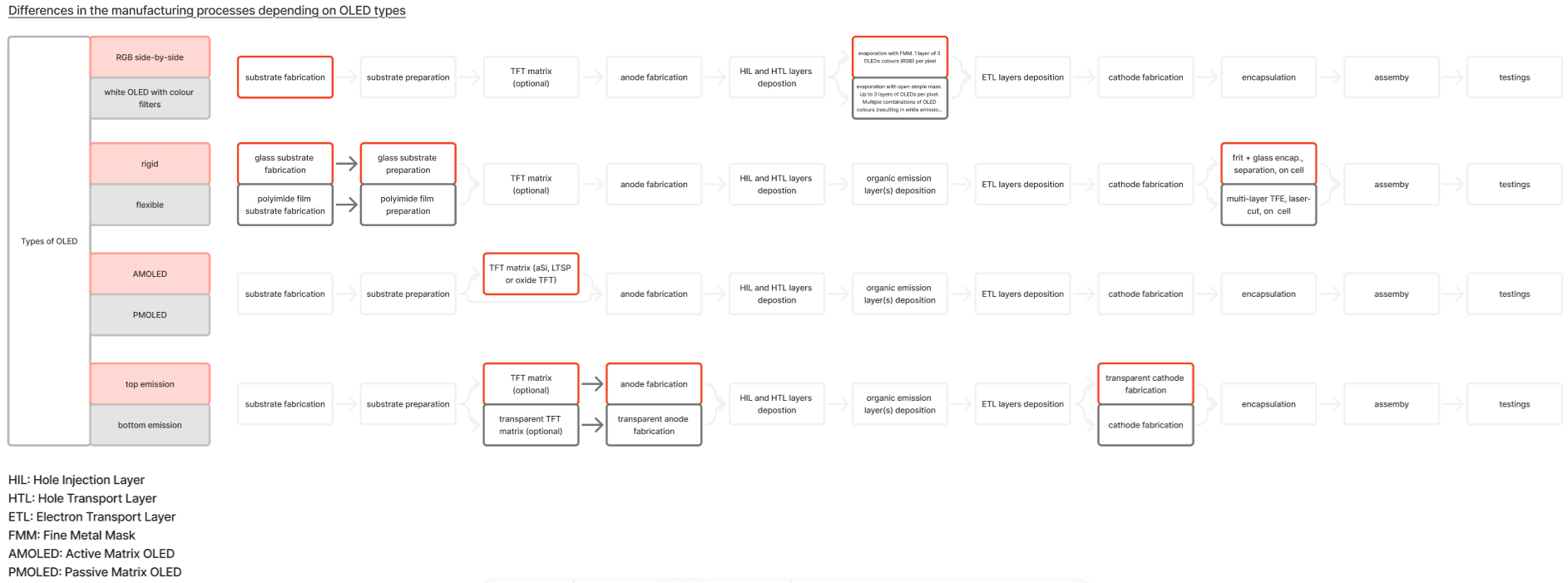 There are multiple process flows depending on the type of OLED that is fabricated.The scheme below lists all the different types of OLED, and how it affects the process flow 1) 2) 3) 4). Each process alternative is explained in the respective section of this page.