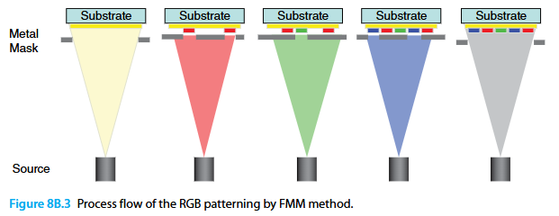 - vacuum thermal evaporation combined with an FMM (Fine Metal Mask)12) - for small sized displays : This method is not selective, meaning the material is deposited everywhere in the equipment chamber : an FMM (Fine Metal Mask) is placed on top of the substrate to hide areas where no material should be deposited. The space between the FMM and the substrate should not be to big to avoid a color mixed pattern. The emissive layer of small display OLEDs consists of 3 emissive materials (respectively emitting red, blue and green light) that are placed side by side. Hence, there are actually 3 successive deposition steps, one for each emissive material as illustrated in the image bellow. The emissive materials are usually organometallic complexes and can be doped or not (e.g.: Alq3 for green and blue phosphorescent light 13), Ir(ppy)3 for phosphorescent green light 14)).