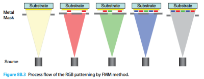 - vacuum thermal evaporation with open mask - for larger sized display: the use of an FMM is not appropriate due to a loss of resolution when the substrate size is increased (there has been a concluant FMM deposition for larger sized screen - 55 inches - but it seems it never reached the production scale).